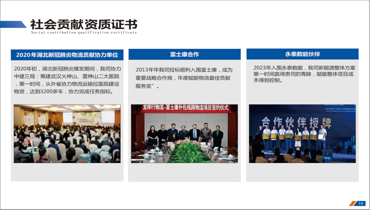 社会荣誉(2020年疫情期间,协助中建三局响应雷神山/火神山医院物资筹措3000多车/2013年合作富士康外包线路3年3.5亿物流额度/2023年永泰数能赋能深能喀什项目得到好评)